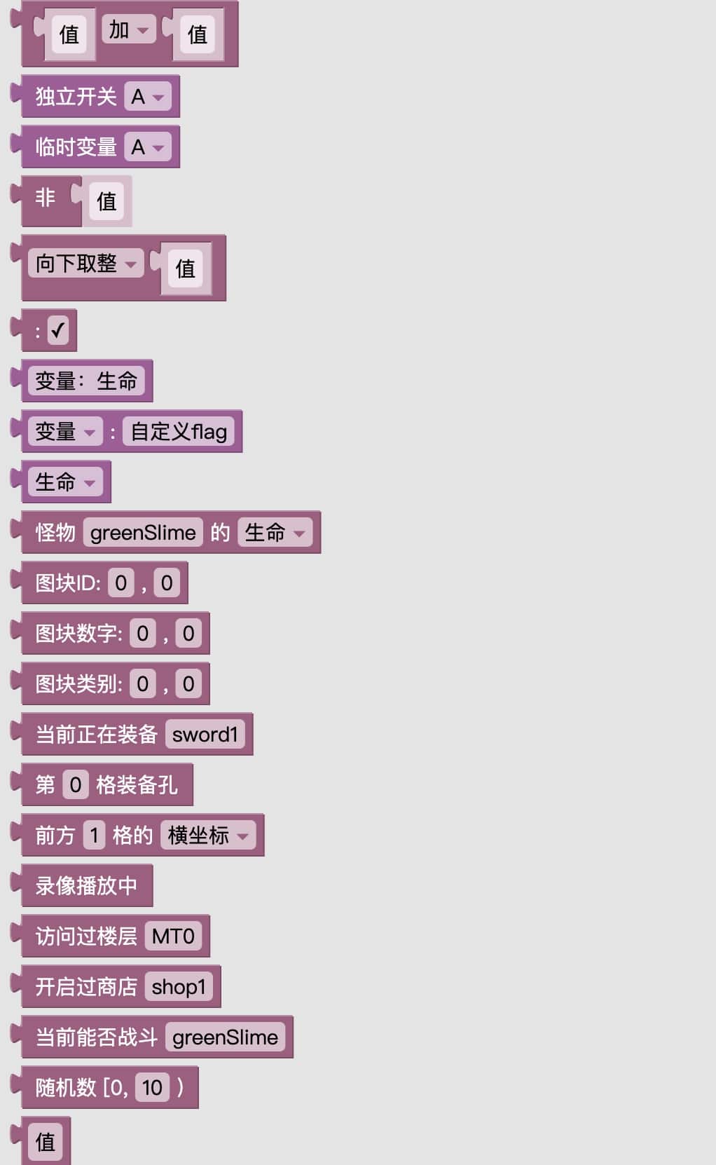 尽管这几个值块是只读的,但您仍然可以使用“设置怪物属性”、“穿脱装备”和“转变图块”等指令去改变它们。